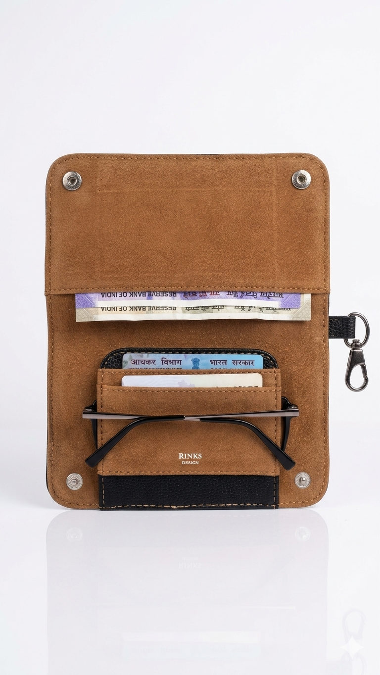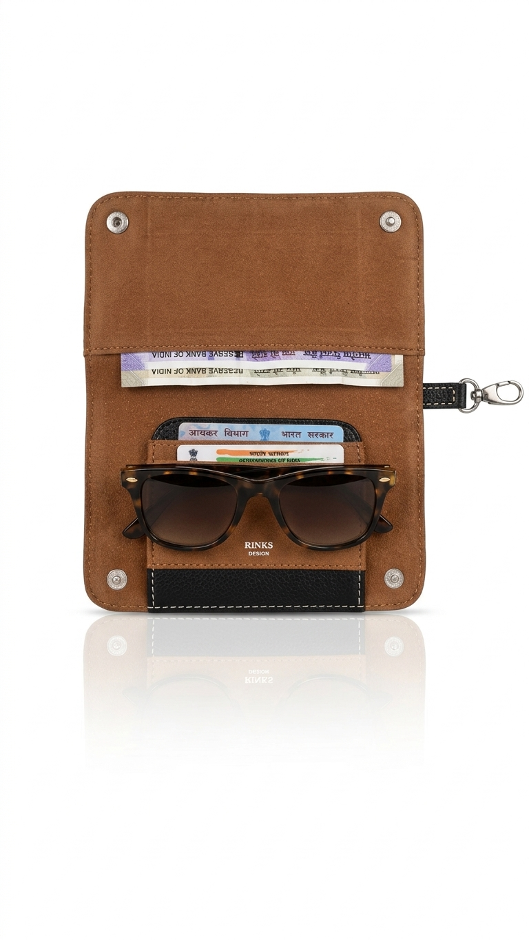 SECURE CLOSURE: Robust double snap-button flap and a central logo-stamped glasses clip ensure all your valuables are safe and won’t slip out.